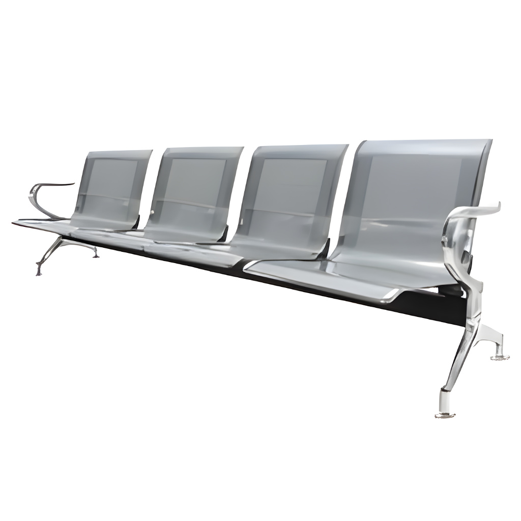 Banca de acero inoxidable para interiores y aeropuertos, cuatro plazas y descansabrazos. Comodidad y resistencia para salas de espera de alto flujo. Orden, higiene y diseño elegante.