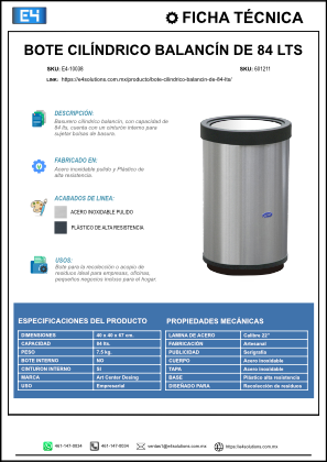 Disponible para entrega nacional y tiempos de preparación ágiles, el bote balancín cilíndrico de 84 litros es la solución premium para la gestión higiénica y elegante de residuos en interiores de alta demanda.