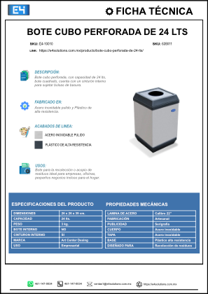 El Bote cubo perforada de 24 litros de acero inoxidable es la opción moderna, versátil e higiénica para oficinas, consultorios, comercios, baños, pasillos y espacios institucionales que buscan eficiencia en la recolección de residuos y una imagen de vanguardia. Su diseño cuadrado compacto (26 × 26 × 39 cm, 3 kg) permite colocarlo en rincones, bajo escritorios o a lo largo de muros, aprovechando el espacio sin sacrificar capacidad.