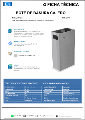 Contenedor para empresas, cuenta entrada superior para el acopio de residuos, con capacidad de 31 lts y fácil vaciado.