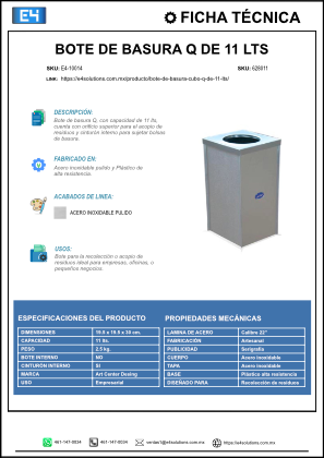 Fabricado en acero inoxidable pulido, este bote ofrece máxima resistencia a la corrosión, humedad, golpes y productos de limpieza, garantizando una larga vida útil y un aspecto profesional aun en usos intensivos. Su diseño minimalista de cubo con bordes rectos combina perfectamente con decoraciones modernas y ejecutivas, proyectando limpieza y orden en cualquier ambiente.