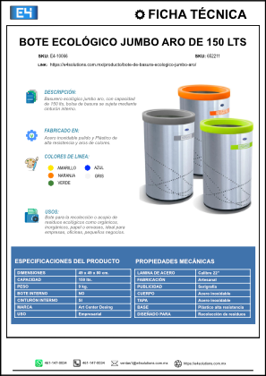 El bote de basura ecológico jumbo aro de 150 litros, fabricado en acero inoxidable pulido, es la solución definitiva para la recolección y reciclaje de grandes volúmenes de residuos en entornos intensivos y de alto tráfico. Su diseño robusto, con dimensiones de 49 × 49 × 80 cm y un peso de 9 kg, lo convierte en el contenedor ideal para oficinas, instituciones, fábricas, centros comerciales, hospitales y espacios públicos que exigen capacidad máxima, seguridad y estética profesional.