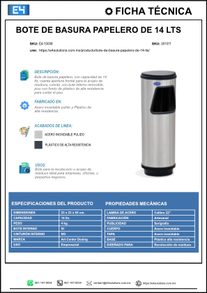 La capacidad de 14 litros lo hace perfecto para la recolección eficiente de papelería, residuos ligeros y basura común sin ocupar demasiado espacio, siendo una opción rentable para oficinas, áreas de atención y espacios compartidos. Además, su base estable y su diseño elegante en acero pulido aseguran un toque moderno y profesional que se integra en cualquier decoración, elevando la imagen del entorno.