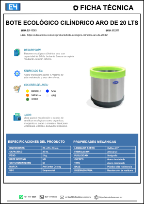 Su tapa tipo aro facilita el depósito de basura sin necesidad de contacto manual, optimizando la higiene y la seguridad en áreas de alto tránsito. Además, los envíos se realizan desde CDMX de 2 a 10 días hábiles y los precios incluyen IVA. El bote ecológico cilíndrico de 20 lts es una opción versátil y eficiente que contribuye al cumplimiento de políticas medioambientales y promueve la cultura del reciclaje en tu empresa o negocio.