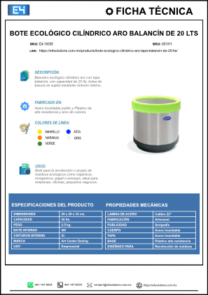 El bote cilíndrico de acero inoxidable con tapa balancín es perfecto para quienes desean mejorar la limpieza, promover el reciclaje eficiente y el cumplimiento de normativas ambientales en cualquier negocio. Transforma tu entorno en un espacio más sustentable y saludable con E4 Solutions, la marca líder en botes y mobiliario urbano ecológico en México.