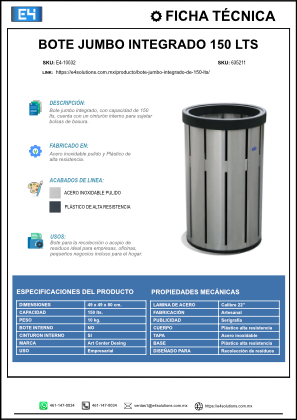 El Bote jumbo integrado de 150 litros de acero inoxidable es la mejor opción para espacios interiores que requieren máxima capacidad y presentación profesional en la gestión de grandes volúmenes de residuos. Ideal para hospitales, corporativos, universidades, centros comerciales, terminales de transporte, gimnasios, industrias y áreas comunes de flujo constante, este contenedor destaca tanto por su funcionalidad como por su diseño contemporáneo en acero inoxidable pulido.