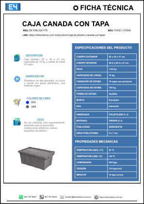 La Caja Canadá con tapa es compatible con etiquetas, códigos y sistemas de trazabilidad, permitiendo una gestión eficiente de inventarios. Su superficie lisa simplifica la limpieza y mantiene altos estándares de higiene, siendo apta para sectores alimentarios y farmacéuticos. Respaldada por Europlast, fabricante líder en México, garantiza calidad, soporte técnico y entrega rápida en toda la República.