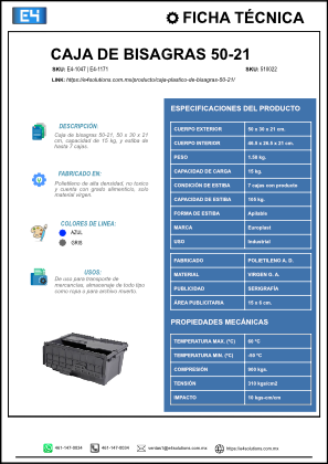 Caja de plástico de bisagras 50-21, polietileno virgen, 15 kg, apilable y con tapa fija. Organización y protección eficiente para industria, talleres y oficinas. Fácil manejo y envío inmediato.