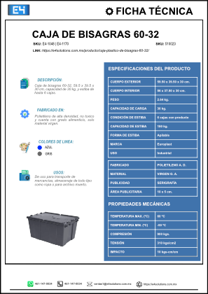 Fabricada en México y distribuida nacionalmente por E4 Solutions, la caja de bisagras 60-32 se entrega con garantía y servicio inmediato en todo México, garantizando eficiencia, orden y protección en cada operación.
