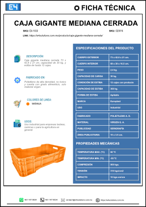 Ideal para el sector agrícola mayorista, carnicerías, industria pesquera, logística alimentaria y mercancía industrial, la caja gigante mediana cerrada facilita el manejo gracias a sus asas ergonómicas y bajo peso (2.4 kg). Con facilidad de lavado, no absorbe olores ni humedad y cumple con normativas para contacto alimenticio. Está disponible en naranja, puede personalizarse con logotipos, etiquetas o serigrafía en área publicitaria de hasta 19 x 3.5 cm.