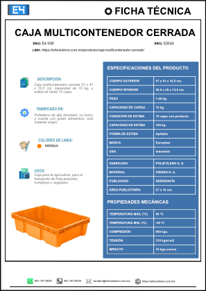 El material es apto para grabado, etiquetas y serigrafía, permitiendo personalización para trazabilidad, branding o codificación. Disponible principalmente en color naranja, cumple con normativas alimentarias y sanitarias, no absorbe olores ni humedad y soporta ciclos intensivos de lavado. La caja Multicontenedor cerrada es perfecta para exhibición, transporte, ordeña, almacenamiento de semillas, picking, inventario industrial y organización doméstica de gran capacidad.
