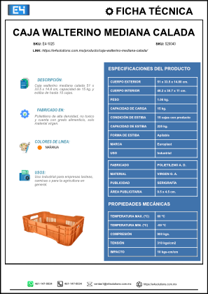 La Caja Walterino mediana calada es una solución ligera, robusta y versátil diseñada para optimizar la logística y conservación de productos frescos, industriales y comerciales. Fabricada en polietileno de alta densidad virgen —no tóxico y grado alimenticio—, su estructura calada permite la máxima ventilación y drenaje, garantizando frescura y protección para frutas, verduras, flores, alimentos, textiles y artículos de almacén o reparto. Las dimensiones estándar de 51 × 33.5 × 14.8 cm y capacidad de hasta 15 kg la hacen práctica y fácil de manejar, ideal para cámaras de refrigeración, estanterías, centrales de abasto, supermercados y bodegas industriales.​