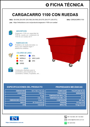 Sus 4 ruedas de 6" permiten una movilidad total con desplazamiento multidireccional, facilitando el transporte de cargas pesadas en pasillos angostos, rampas y zonas de alto tránsito sin esfuerzo. El diseño frontal inclinado hace que el vaciado manual sea rápido, ergonómico y seguro, reduciendo la fatiga del personal y optimizando los tiempos de trasiego. Disponible en siete colores para la identificación y organización de operaciones, este carro puede personalizarse con logotipos y leyendas, adaptándose a cualquier sistema de codificación interna.