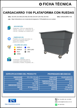 Contenedor para lavandería con capacidad de 1100 lts, cuenta con bandeja con 4 ruedas de 6″, además puede elegir entre 7 colores. (OJO producto de IMPORTACIÓN, contactar con E4 Solutions para revisar stock según color).