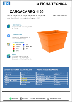 Con una capacidad real de 1100 litros y dimensiones generosas (141 × 103 × 92 cm), el Cargacarro 1100 permite movilizar hasta 400 kg, este carro NO está equipado con ruedas contamos con otros modelos que si cuenten con ruedas o base con ruedas. Su peso de solo 40 kg y diseño ergonómico inclinado facilitan el vaciado manual rápido y sin esfuerzo, minimizando la fatiga del personal y acelerando los tiempos de trabajo. La superficie completamente lisa en su interior previene acumulación de suciedad, facilita la limpieza y evita focos de infección, cumpliendo con altos estándares de higiene y seguridad en el sector salud, hotelero o institucional.