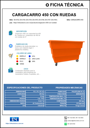 El Cargacarro 450 está equipado con cuatro ruedas giratorias de alta resistencia de 4”, lo cual brinda movilidad multidireccional, estabilidad y un desplazamiento suave incluso en pasillos estrechos, rampas o áreas congestionadas. El peso total de 32kg y dimensiones de 110 × 76 × 84 cm hacen que, aun con carga máxima (450 lts), el manejo sea ergonómico, ágil y seguro para el personal. Disponible en varios colores distintos, es ideal para segmentar áreas de trabajo, implementar rutas o cumplir con normativas internas de organización y seguridad.