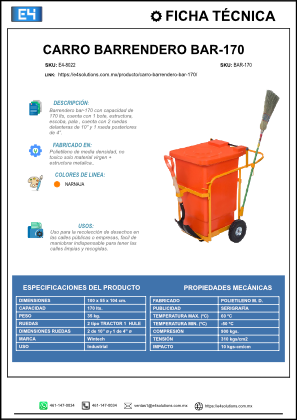 El carro barrendero BAR-170 es la herramienta clave para la limpieza urbana, industrial y comercial, diseñado para brindar máxima eficiencia y ergonomía en la recolección y gestión de residuos sólidos. Con capacidad de 170 litros, este barrendero ofrece amplio espacio para residuos, optimizando las operaciones de barrido y limpieza en zonas públicas, empresas, presidencias, parques y centros comerciales.