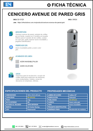 El cenicero Avenue de pared gris es la elección profesional, práctica y elegante para la recolección de colillas y residuos de tabaco en áreas exteriores e interiores. Fabricado con cuerpo de acero color gris calibre 22 y tapa en acero inoxidable, este cenicero combina robustez y diseño, ideal para mantener limpios y ordenados los accesos, fachadas y zonas de fumadores en empresas, restaurantes, hoteles, comercios, centros corporativos y edificios urbanos modernos.​
