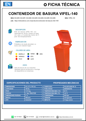 Su material virgen ofrece protección contra rayos UV y productos químicos, garantizando higiene y facilidad en la limpieza, evitando la acumulación de suciedad y malos olores. El Vifel-140 es apto para aplicaciones comerciales, industriales o domésticas, y contribuye directamente a optimizar la recolección de basura, reducir los costes operativos y fomentar la sostenibilidad ambiental. Su preparación de pedido va de 7 a 12 días hábiles y cuenta con garantía por defectos de fabricación. La compra del Vifel-140 significa invertir en calidad, resistencia y eficacia para el manejo de residuos.