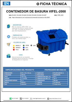 El contenedor de basura VIFEL-2000 de E4 Solutions está diseñado para empresas, municipios e instituciones que requieren equipos de recolección robustos y de gran capacidad. Fabricado en polietileno de media densidad mediante sistema de rotomoldeo, combina durabilidad, resistencia y diseño funcional, garantizando un rendimiento superior en exteriores y zonas industriales. Con una capacidad de 2000 litros y un peso de 136,1 kg, este contenedor soporta el manejo intensivo de desechos sólidos sin deformarse ni agrietarse ante el sol, humedad o impactos.