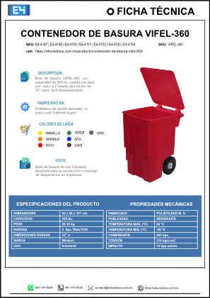 La fabricación con polietileno de media densidad 100% virgen no solo aporta ligereza y resistencia, sino que garantiza que el contenedor sea reciclable al final de su vida útil, apoyando la economía circular y la responsabilidad ambiental. El Vifel-360 cumple con los requisitos más exigentes de limpieza urbana e industrial, siendo apto para parques, hospitales, escuelas, centros comerciales, restaurantes y unidades habitacionales. Sus dimensiones (82 × 69 × 107 cm) y capacidad de carga de hasta 144 kg lo hacen funcional, estable y resistente ante cargas intensivas.