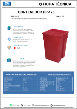 El contenedor HP-125 de E4 Solutions es un contenedor cuadrado diseñado específicamente para la recolección segura y eficiente de residuos peligrosos biológico-infecciosos (RPBI). Con una capacidad de 125 litros, es ideal para laboratorios, hospitales, clínicas y otros entornos que requieran un manejo especializado de desechos peligrosos.