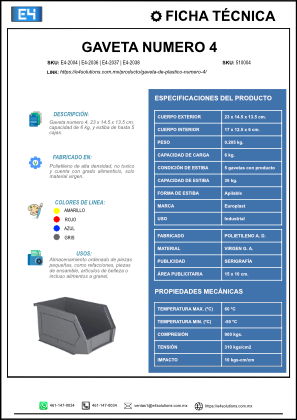 La Gaveta de plástico número 4 es la aliada ideal para el almacenamiento, clasificación y organización de herramientas, partes, tornillería, refacciones, componentes automotrices, insumos industriales o artículos de ferretería en almacenes, áreas de producción, talleres mecánicos, refaccionarias, tiendas de pintura, comercios y oficinas. Con una capacidad de hasta 6 kg y dimensiones de 23 × 14.5 × 13.5 cm, ofrece espacio adicional y robustez para gestionar elementos de tamaño medio o piezas de alto movimiento.