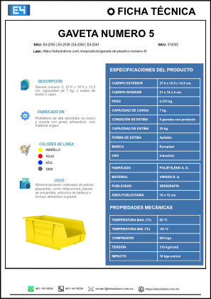 La gaveta número 5 está disponible en varios colores para facilitar la codificación y la identificación visual por áreas, productos o procesos, agilizando inventarios y reduciendo errores. También puede personalizarse con etiquetas, leyendas o códigos QR para sistemas avanzados de logística interna. Es lavable, fácil de desinfectar y 100% reciclable, contribuyendo a la sustentabilidad y gestión eficiente de residuos.