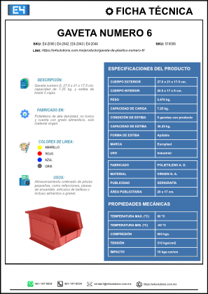 La Gaveta de plástico número 6 es la opción profesional para empresas, talleres, almacenes, industrias, ferreterías y laboratorios que requieren máxima capacidad, organización eficiente y acceso rápido a piezas, herramientas, insumos y refacciones voluminosas. Con dimensiones de 27 × 21 × 17.7 cm y capacidad de 7.25 kg, su gran tamaño y robustez la hacen ideal para almacenar partes de maquinaria, herramientas eléctricas, refacciones automotrices, cables, equipo de laboratorio, productos de limpieza, materiales de jardinería y utensilios de cocina industrial.