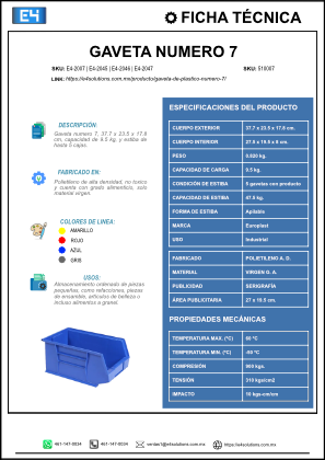 Es lavable, resistente a manchas y a temperaturas de -5 °C a 60 °C, 100% reciclable y apta para sistemas de etiquetado y códigos QR. La entrega es rápida (3–5 días hábiles) y el producto cuenta con garantía de fábrica. Si buscas durabilidad máxima, organización y eficiencia logística, la gaveta de plástico número 7 es la inversión inteligente para tu empresa.