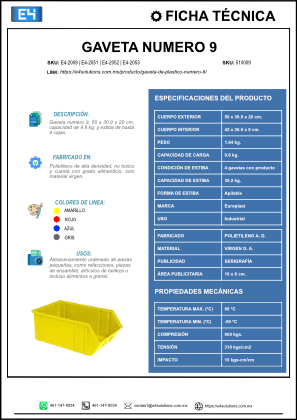 La apertura frontal y paredes altas mejoran el acceso rápido y visualización instantánea del contenido, lo que agiliza la logística interna y la administración de inventario. La Gaveta número 9 es la favorita para sectores de manufactura, logística, distribución, automotriz, construcción y hasta comercios agrícolas, ya que su sólida estructura soporta trabajo intensivo sin deformaciones. Está disponible en varios colores para codificación visual de insumos, áreas o procesos, y permite el uso de etiquetas, códigos QR y sistemas de inventario digital avanzado.
