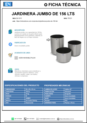 La jardinera jumbo de 156 litros en acero inoxidable pulido es la opción definitiva para decorar y transformar grandes espacios urbanos, comerciales y residenciales con volumen verde, elegancia y máxima durabilidad. Sus dimensiones de 49 × 49 × 65 cm y sólido peso de 19 kg la hacen perfecta para terrazas, plazas, jardines corporativos, entradas de hoteles, centros comerciales y desarrollos institucionales, donde el impacto visual es prioridad.