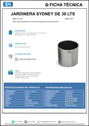 La jardinera Sydney de 30 litros, fabricada en acero inoxidable pulido, es la opción premium y elegante para decorar espacios exteriores o interiores en proyectos urbanos, comerciales, corporativos y residenciales. Con su diseño cuadrado minimalista (32 × 32 × 30 cm), esta jardinera añade un toque moderno y sofisticado en jardines, terrazas, balcones, oficinas, áreas comunes de edificios, hoteles, restaurantes y centros comerciales. Es ideal para delimitar espacios, dividir zonas de tránsito y aportar vegetación en ambientes con alta demanda de diseño y durabilidad.