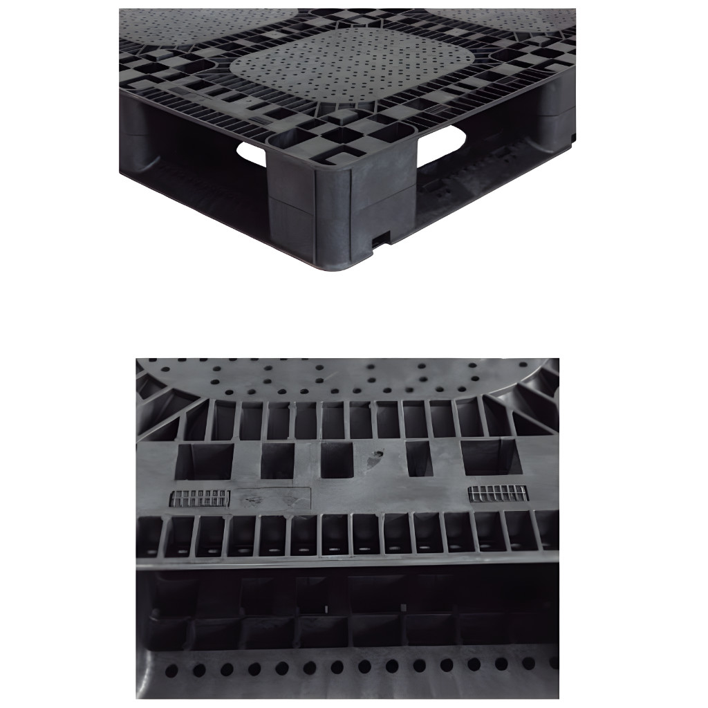 Pallet de plástico Heavy Duty negro 120 x 100 x 15 cm, superficie antiderrapante con zonas texturizadas, capacidad 13,000 kg estática y 2,500 kg dinámica.