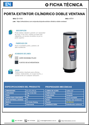 Su estructura protege el extintor contra caídas, golpes, polvo y suciedad. La forma cilíndrica permite fácil colocación en esquinas, pasillos y accesos, maximizando visibilidad y orden institucional. Las ventanas dobles favorecen la inspección periódica sin necesidad de desarmar el soporte, ahorrando tiempo y cuidando la presentación del extintor. Este porta extintor es compatible con modelos de 9 kg y 12 lb CO₂, y con otros diseños de la línea E4 Solutions como cilíndricos chicos y grandes para equipar tu proyecto completo.