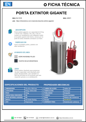 Porta extintor gigante acero inoxidable, máxima capacidad (50 kg/125 lb CO₂). Súper resistente, cumple normas y fácil limpieza. Ideal para industrias y almacenes. Garantía y entrega nacional.