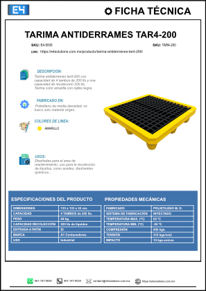 Disponible en stock y con tiempos de entrega de 3 a 8 días hábiles, E4 Solutions respalda tu operación con soporte técnico, servicio a nivel nacional y experiencia comprobada en soluciones plásticas industriales para 5,000 clientes satisfechos. Haz más seguro, eficiente y responsable tu entorno laboral con la tarima antiderrames TAR4-200.