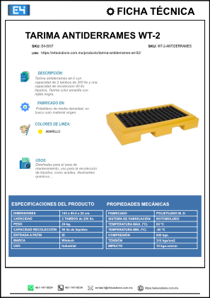 Disponible con entrega nacional entre 7 y 12 días hábiles y garantía de 30 días por defectos de fabricación, la tarima antiderrames WT-02 es una solución integral recomendada para cualquier empresa seria en gestión y contención de líquidos industriales.