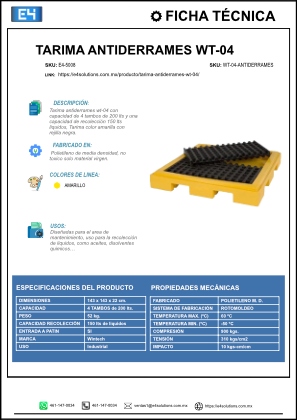 La tarima antiderrames WT-04 de E4 Solutions está diseñada para la gestión profesional y segura de líquidos industriales, químicos, aceites y residuos peligrosos. Fabricada en polietileno de media densidad 100% virgen, su resistencia superior a impactos, corrosión, rayos UV y productos químicos permite un uso intensivo en exteriores e interiores, con garantía de durabilidad de hasta 7 años.