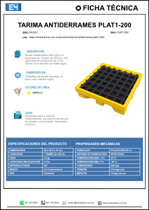 La PLAT1-200 es indispensable en áreas de acopio, fábricas, almacenes y plantas de procesamiento químico y automotriz, donde cada derrame accidental representa un riesgo para trabajadores y sanciones legales si no se cuenta con un sistema de contención adecuado. Fácil de limpiar y mantener, con vida útil de hasta 8-10 años y garantía directa contra defectos de fabricación, el modelo puede entregarse en color amarillo con opción de preparación en 3 a 8 días hábiles.